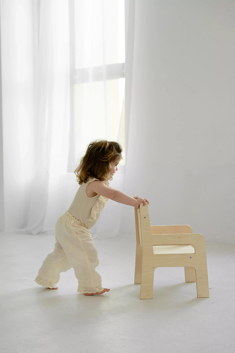 Drevená detská stolička je navrhnutá pre deti rôzneho veku – poslúži ako ročnému dieťaťu, ktoré objavuje svet, tak aj staršiemu, kreatívnemu predškolákovi. Poskytuje pevnú oporu chrbta a zároveň zaisťuje pohodlné sedenie pri hraní, kreslení alebo stolovaní. Skvele sa uplatní aj v kuchyni alebo kúpeľni – dieťa si môže stúpnuť na sedák a ľahko dosiahne na pracovnú dosku či umývadlo. Všetky hrany sú starostlivo zaoblené, aby bola zaistená maximálna bezpečnosť malých používateľov.