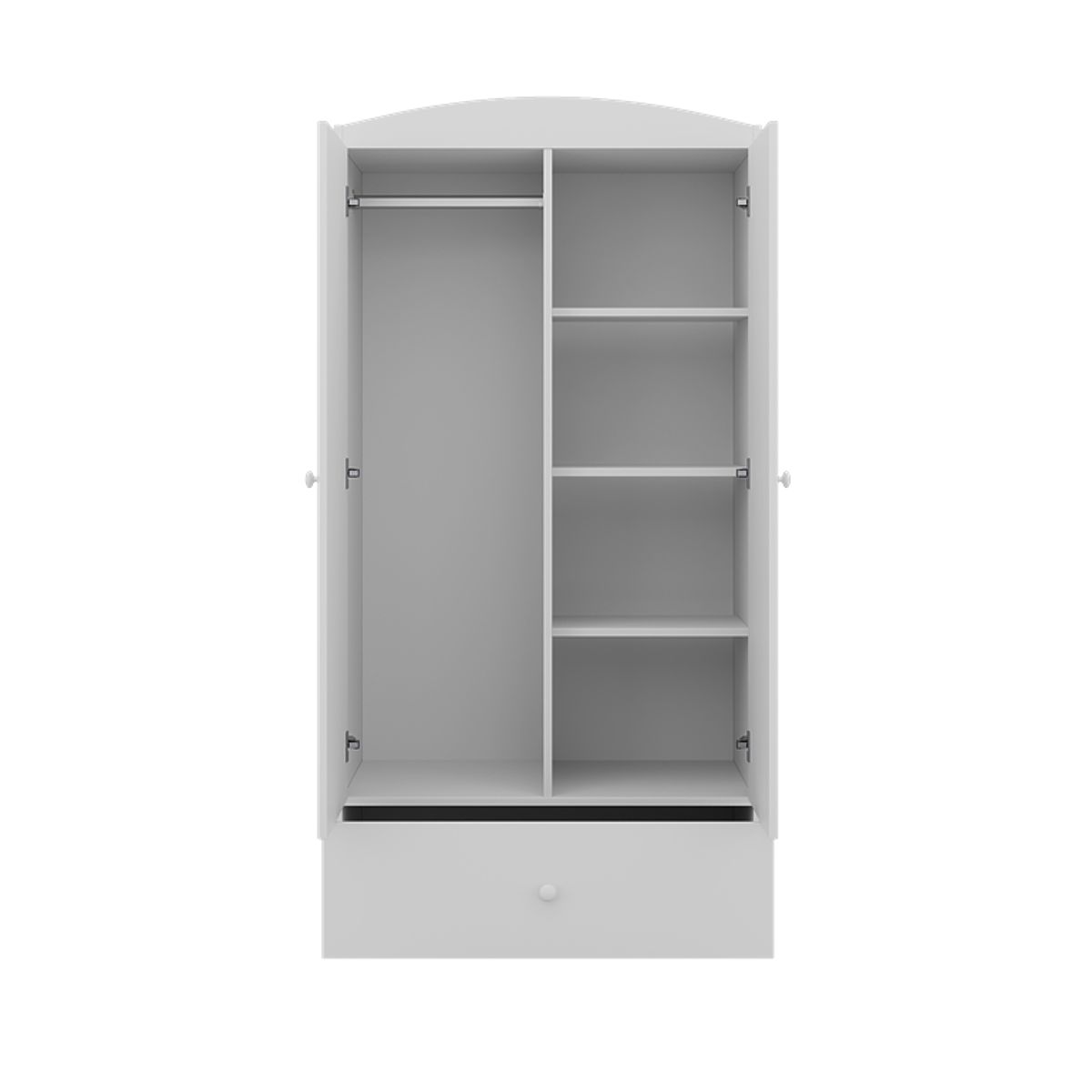 Korpus skrine je rozdelený na 2 polovice, v jednej sa nachádza tyč a v druhej 4 police, ideálny pre uloženie oblečenia a hračiek. Rozmery políc: 40 x 54 cm, od seba sú vzdialené 30 cm.