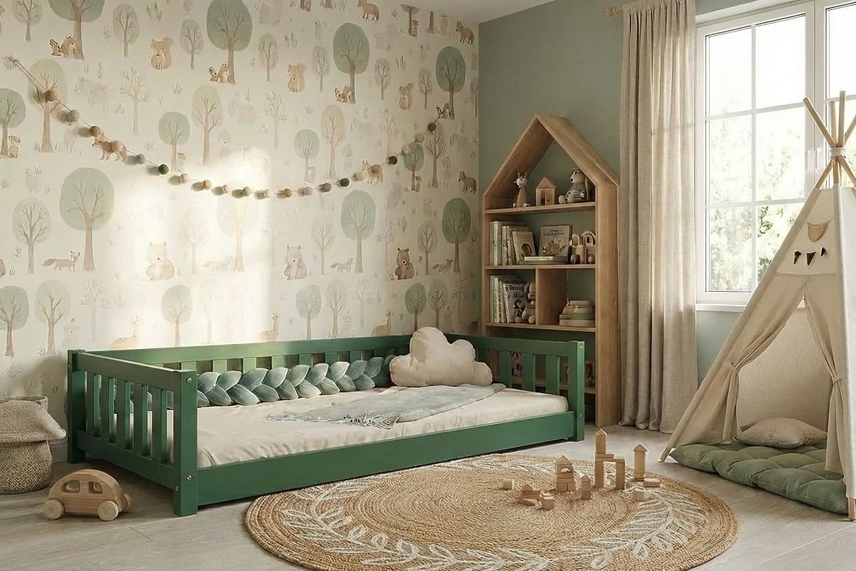 Moderná detská posteľ Montessori Meadow v zelenej farbe, navrhnutá podľa základných princípov Montessori, zaujme všetkých rodičov, ktorí chcú podporiť samostatnosť a nezávislosť svojich detí. Táto nízka posteľ so zábranou ponúka bezpečné a pohodlné prostredie pre hru, denný odpočinok aj nočný spánok. Nadčasový dizajn a použitie borovicového dreva pôsobí v každej detskej izbe esteticky príjemne a vytvára v nej harmonický priestor pre prirodzený rozvoj detí.
