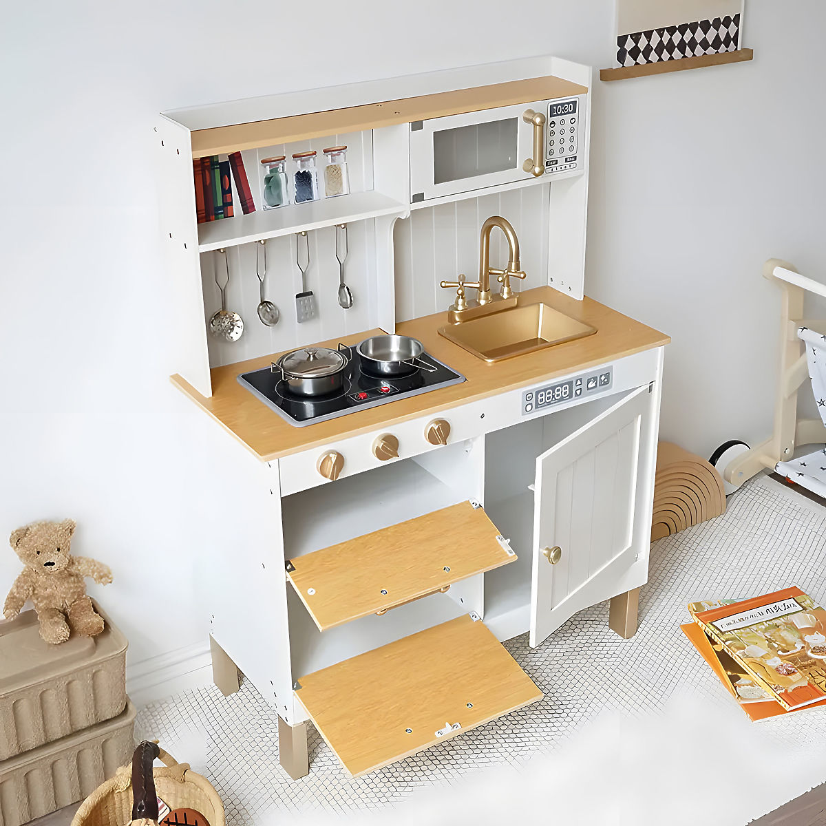 Babynabytek.sk » Kuchynky / Drevené kuchynky / Detská kuchynka so zvukmi a LED drevená veľká otváracie skrinky 7 doplnkov ECOTOYS