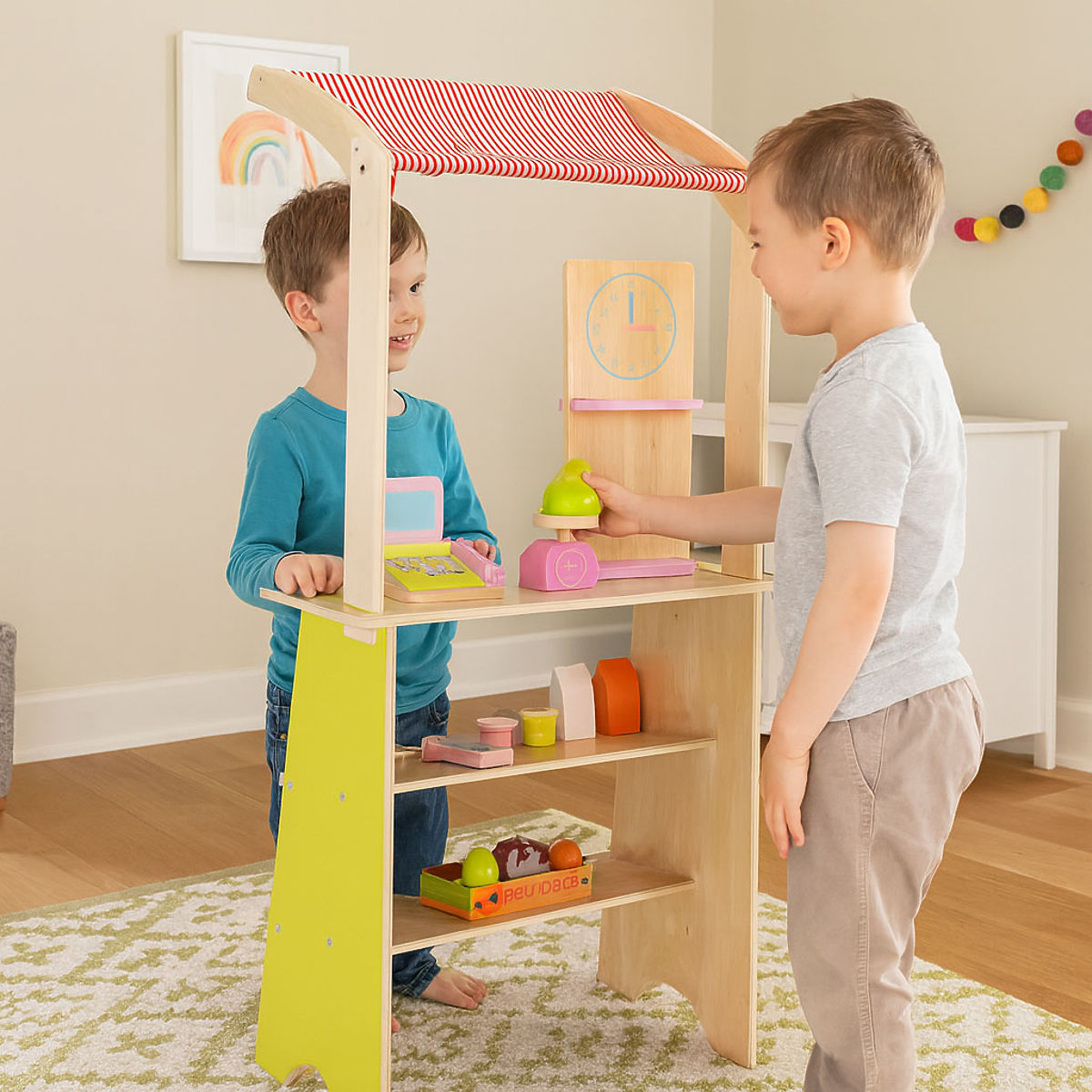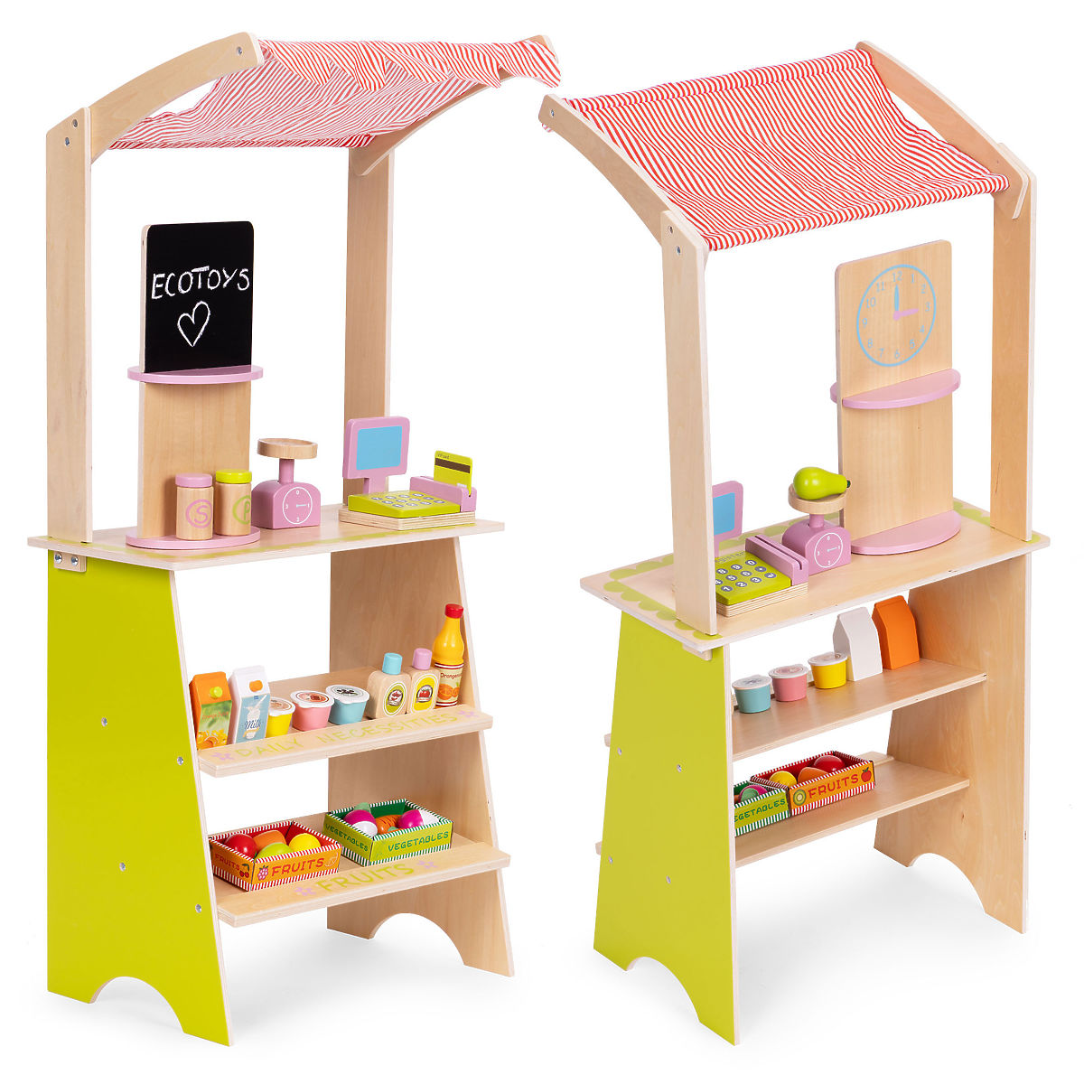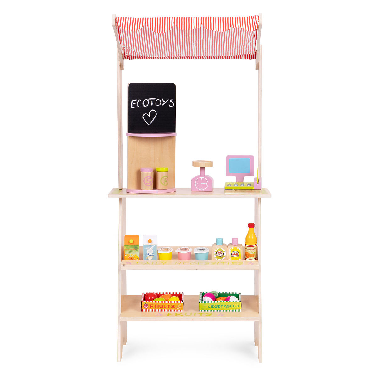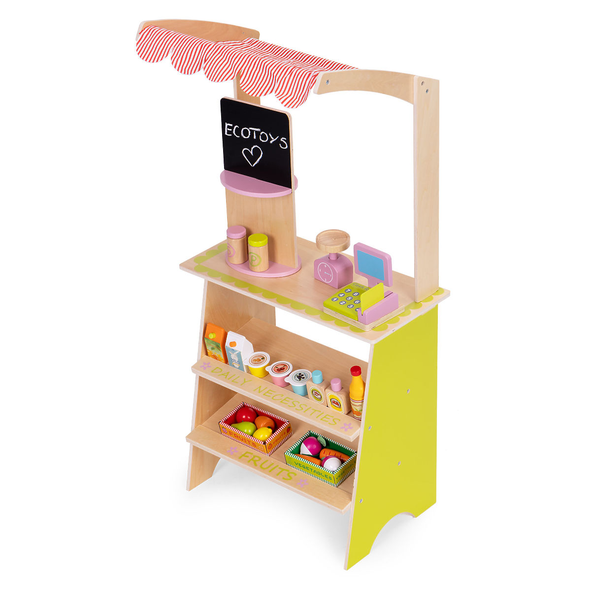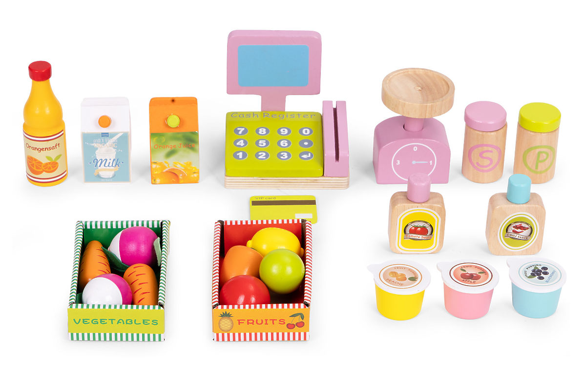 Drevený stánok ECOTOYS povzbudzuje deti k aktívnej hre na hranie rolí, učí základné sociálne správanie, ako sú nákupy, predaj a počítanie. Hračka je ideálna ako domov, tak do škôlky alebo herne. Je to skvelý nástroj pre učenie spolupráce, komunikácie a kreatívneho myslenia. Vďaka prítomnosti pokladne, terminálu, váhy a početných potravinových produktov sa hra stáva realistickou a zároveň pútavou. Produkt rozvíja koordináciu ruka-oko, stimuluje predstavivosť a povzbudzuje dieťa k samostatnému konaniu.