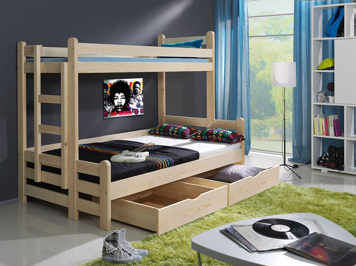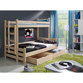 Detská poschodová posteľ s rozšíreným spodným lôžkom vyrobená z borovicového dreva, lakovaná troma vrstvami laku. Vlastní certifikát "Inštitútu technológie dreva v Poznani", ktorý je pre predaj poschodových postelí nutnosťou v EÚ.